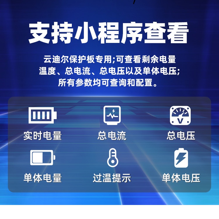 3、可通过手机APP或微信小程序实时显示保护板数据,包括电量、电压和电流等数据。