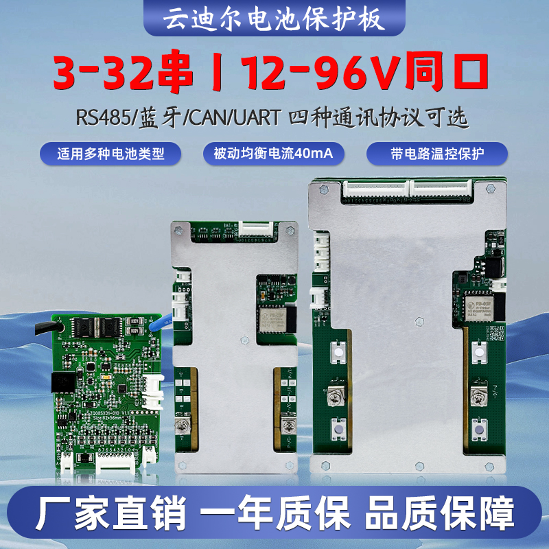 1、新能源类主营产品:YDEBMS云迪尔电池保护板(3-32串12V-96V带UART通讯、内置蓝牙、隔离RS485通讯或隔离CAN通讯等软件板,集成被动均衡或者主动均衡功能可选)。